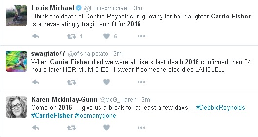 You'd have to have a hard heart indeed not to be mildly moved by the poetic tragedy of Debbie Reynolds dying just a day after her daughter, Carrie Fisher. And just days before the passing of Carrie Fisher, George Michael's heart gave out one last time. A few days after Donald Trump was elected Leonard Cohen passed away prompting (((Jonathon Freedland))) to write in The Guardian ''Trump’s world is too dark – even for Leonard Cohen''. At the beginning of 2016 we lost Starman David Bowie and at the end we lost Star Wars's Princess Leia, and in-between the western political landscape was under a seemingly relentless populist revolt.